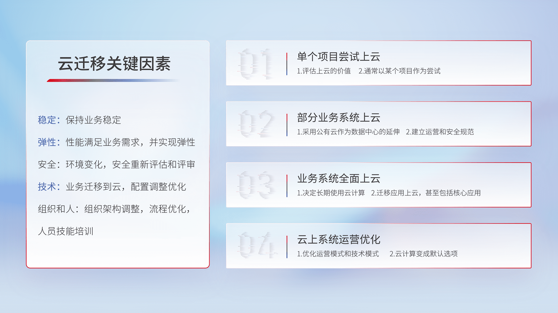 结合实际业务,,,,从规划设计、、、云平台选型、、、云原生改造、、、数据迁移、、、集成交付,,,,迁移全过程为客户识别最佳上云路径,,,,做好风险识别管理,,,,设计网络架构、、、、身份权限、、安全审计合规、、、操作审计、、、、日志审计、、监控告警策略、、多站点容灾设计等,,,,对云上基础设施进行整体规划,,提升IT治理水平,,,以满足弹性、、高可用、、、、高性能的需求。。。。