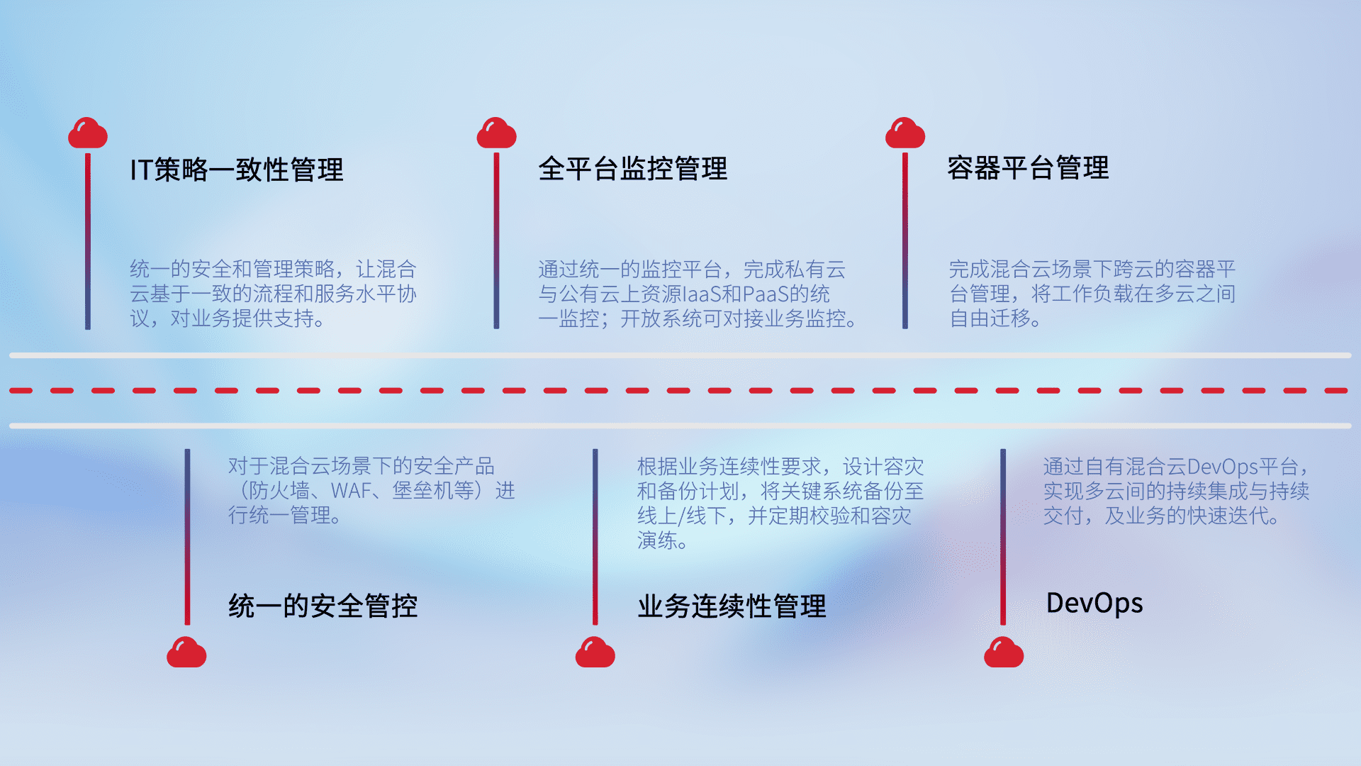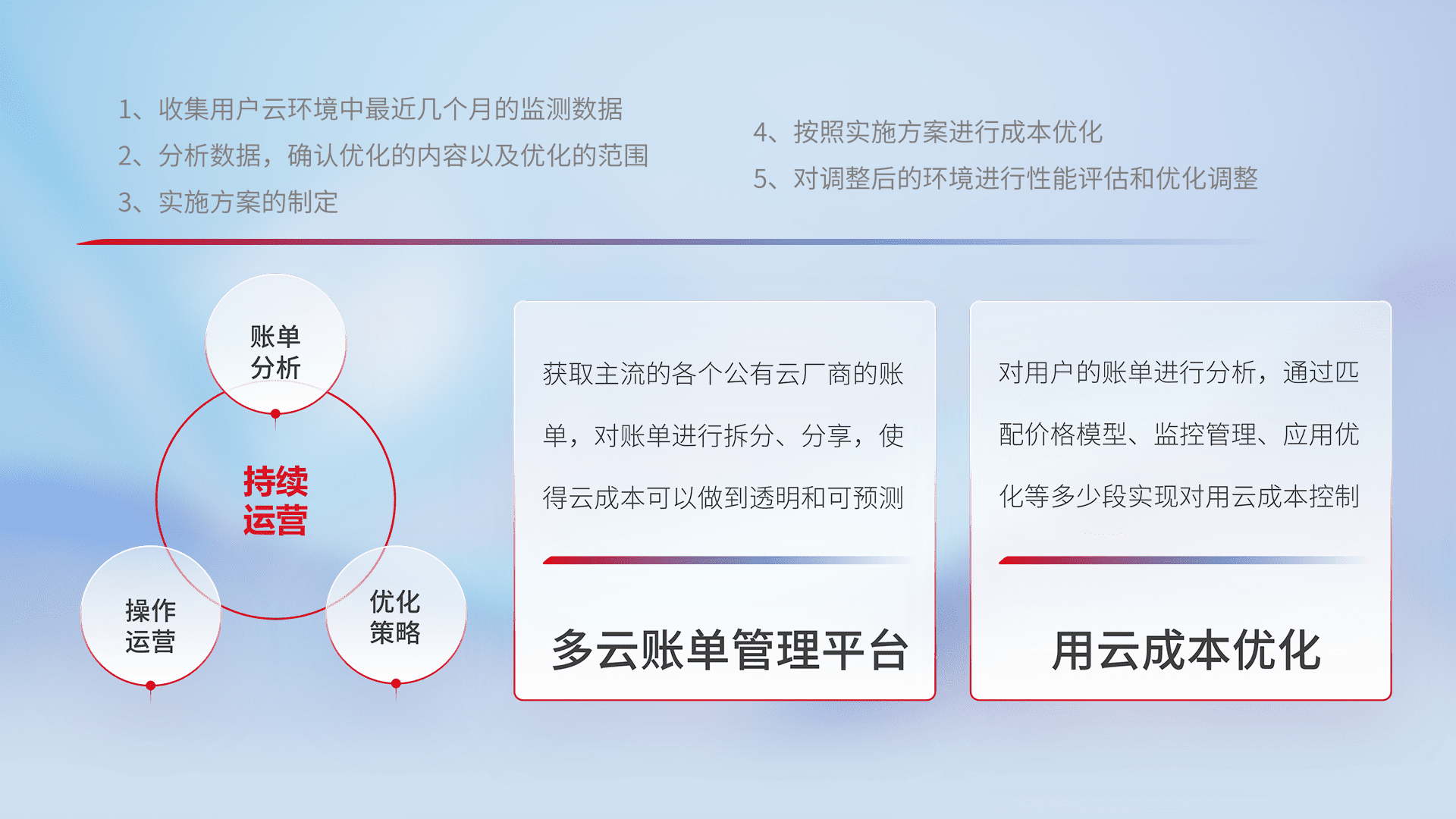 通过多云纳管,,以统一的资源数据模型把客户的云资源进行抽象和封装,,进而实现对多云资源的统一操作,,,,保障云资源管理的可靠性、、稳定性与可用性。。。。量身定制化运维内容,,,,配置、、、开发运维、、、、补丁管理、、、备份、、、、监控、、、、认证和访问管理、、、审计和日常巡检等,,,,保障在用云过程中的可靠度,,,,稳定度以及高可用率。。。。