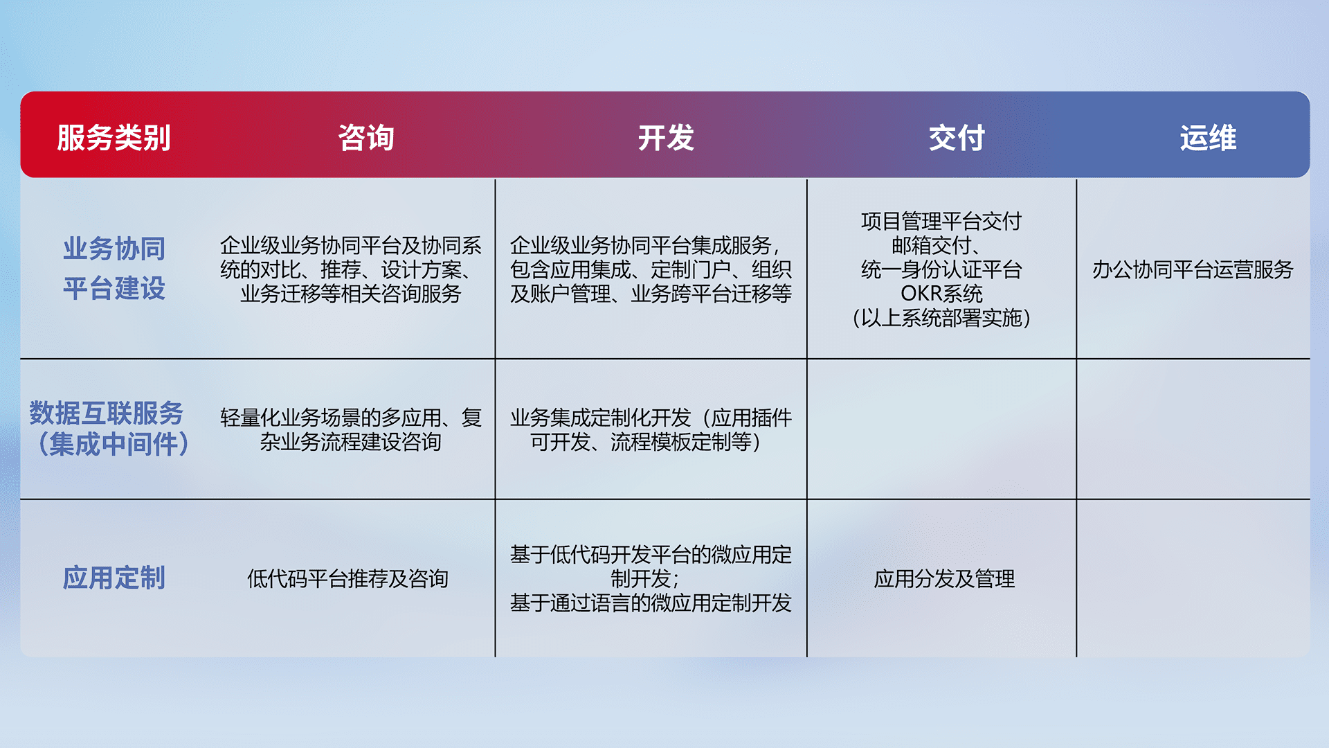 针对钉钉、、企微、、IDaas等平台级产品提供产品的规划、、方案、、、交付、、定制化开发等服务,,,,实现如统一协同办公、、智能客户服务、、混合会议管理、、、智能数据查询、、、等业务场景,,,实现数字化转型。。。。
